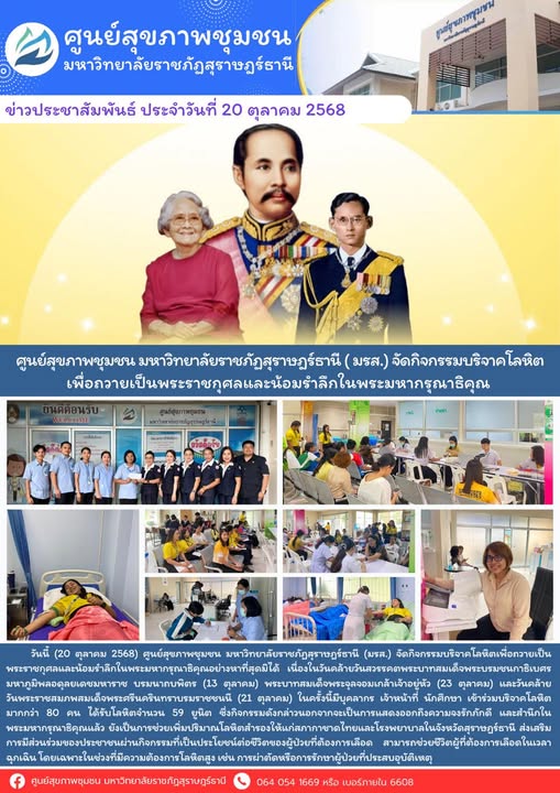วันนี้ (20 ตุลาคม 2568) ศูนย์สุขภาพชุมชน มหาวิทยาลัยราชภัฏสุราษฎร์ธานี (มรส.) จัดกิจกรรมบริจาคโลหิตเพื่อถวายเป็นพระราชกุศลและน้อมรำลึกในพระมหากรุณาธิคุณอย่างหาที่สุดมิได้ เนื่องในวันคล้ายวันสวรรคตพระบาทสมเด็จพระบรมชนกาธิเบศร มหาภูมิพลอดุลยเดชมหาราช บรมนาถบพิตร (13 ตุลาคม) พระบาทสมเด็จพระจุลจอมเกล้าเจ้าอยู่หัว (23 ตุลาคม) และวันคล้ายวันพระราชสมภพสมเด็จพระศรีนครินทราบรมราชชนนี (21 ตุลาคม) ในครั้งนี้มีบุคลากร เจ้าหน้าที่ นักศึกษา เข้าร่วมบริจาคโลหิตมากกว่า 80 คน ได้รับโลหิตจำนวน 59 ยูนิต ซึ่งกิจกรรมดังกล่าวนอกจากจะเป็นการแสดงออกถึงความจงรักภักดี และสำนึกในพระมหากรุณาธิคุณแล้ว ยังเป็นการช่วยเพิ่มปริมาณโลหิตสำรองให้แก่สภากาชาดไทยและโรงพยาบาลในจังหวัดสุราษฎร์ธานี ส่งเสริมการมีส่วนร่วมของประชาชนผ่านกิจกรรมที่เป็นประโยชน์ต่อชีวิตของผู้ป่วยที่ต้องการเลือด สามารถช่วยชีวิตผู้ที่ต้องการเลือดในเวลาฉุกเฉิน โดยเฉพาะในช่วงที่มีความต้องการโลหิตสูง เช่น การผ่าตัดหรือการรักษาผู้ป่วยที่ประสบอุบัติเหตุ