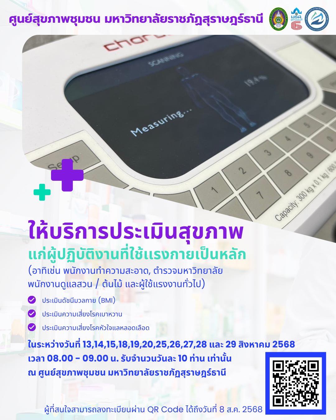ศูนย์สุขภาพชุมชน มหาวิทยาลัยราชภัฏสุราษฎร์ธานี จัดกิจกรรม “บริการประเมินสุขภาพสำหรับผู้ปฏิบัติงานที่ใช้แรงกายเป็นหลัก” เช่น พนักงานทำความสะอาด เจ้าหน้าที่รักษาความปลอดภัย พนักงานดูแลสวน/ต้นไม้ และผู้ใช้แรงงานทั่วไป เพื่อส่งเสริมสุขภาวะที่ดีและการดูแลสุขภาพอย่างเหมาะสมกับลักษณะการทำงาน