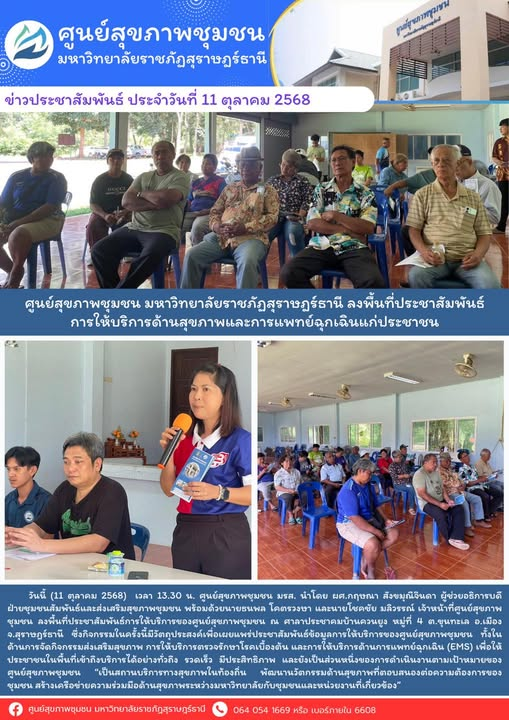 วันนี้ (11 ตุลาคม 2568) เวลา 13.30 น. ศูนย์สุขภาพชุมชน มรส. นำโดย ผศ.กฤษณา สังขมุณีจินดา ผู้ช่วยอธิการบดี ฝ่ายชุมชนสัมพันธ์และส่งเสริมสุขภาพชุมชน พร้อมด้วยนายธนพล โคตรวงษา และนายโชคชัย มลิวรรณ์ เจ้าหน้าที่ศูนย์สุขภาพชุมชน ลงพื้นที่ประชาสัมพันธ์การให้บริการของศูนย์สุขภาพชุมชน ณ ศาลาประชาคมบ้านควนยูง หมู่ที่ 4 ต.ขุนทะเล อ.เมือง จ.สุราษฎร์ธานี ซึ่งกิจกรรมในครั้งนี้มีวัตถุประสงค์เพื่อเผยแพร่ประชาสัมพันธ์ข้อมูลการให้บริการของศูนย์สุขภาพชุมชน ทั้งในด้านการจัดกิจกรรมส่งเสริมสุขภาพ การให้บริการตรวจรักษาโรคเบื้องต้น และการให้บริการด้านการแพทย์ฉุกเฉิน (EMS) เพื่อให้ประชาชนในพื้นที่เข้าถึงบริการได้อย่างทั่วถึง รวดเร็ว มีประสิทธิภาพ และยังเป็นส่วนหนึ่งของการดำเนินงานตามเป้าหมายของศูนย์สุขภาพชุมชน “เป็นสถานบริการทางสุขภาพในท้องถิ่น พัฒนานวัตกรรมด้านสุขภาพที่ตอบสนองต่อความต้องการของชุมชน สร้างเครือข่ายความร่วมมือด้านสุขภาพระหว่างมหาวิทยาลัยกับชุมชนและหน่วยงานที่เกี่ยวข้อง”